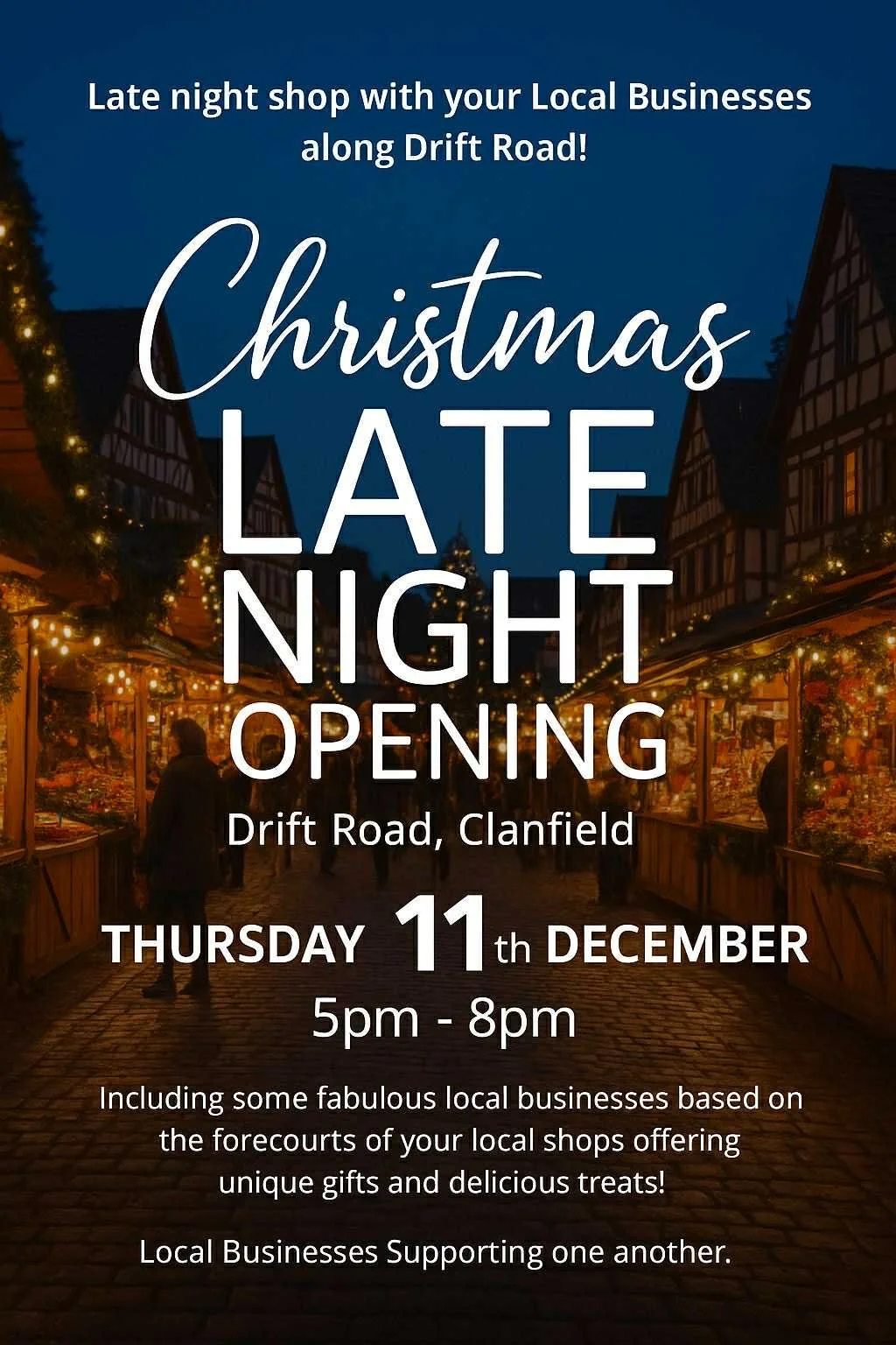 Join us for a magical evening of festive shopping along Drift Road in Clanfield! Our local businesses are opening their doors late to bring you an unforgettable Christmas experience.
